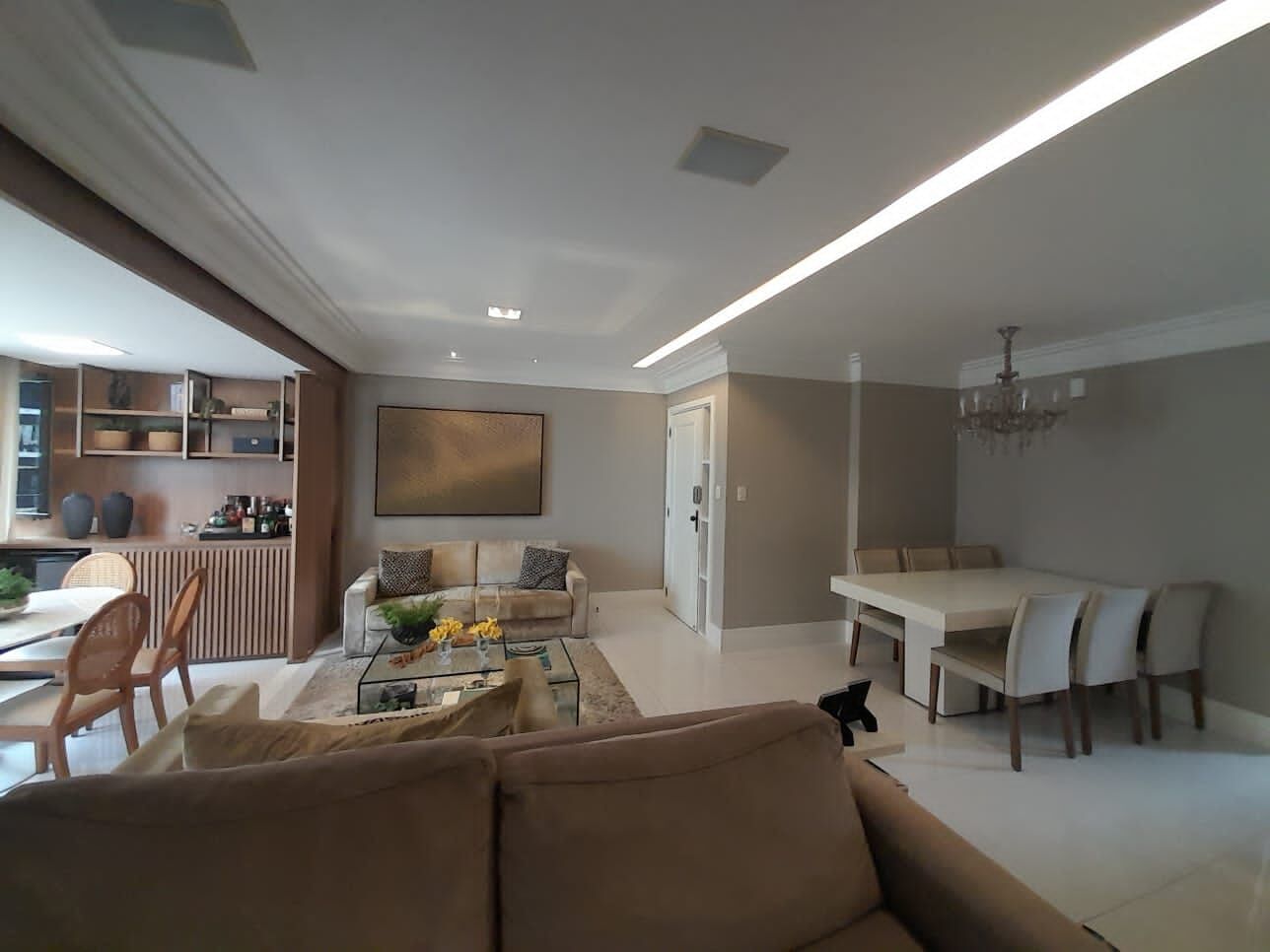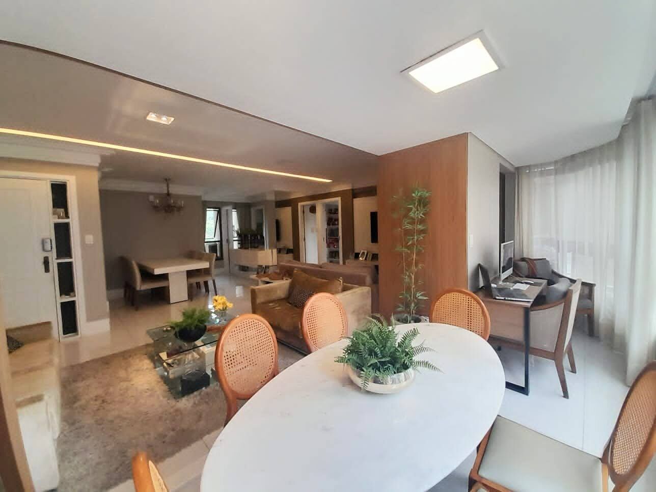 Excelente apartamento de 126 m². Sendo 3 suítes, sala ampliada integrada à varanda gourmet, com teto rebaixado em sanca de gesso e iluminação em LED em todos os cômodos, todos os ambientes são devidamente climatizados e com piso em porcelanato. A cozinha planejada, com armários embutidos, oferece praticidade e funcionalidade. O imóvel ainda conta com lavabo, área de serviço e dependência completa. Com duas vagas de garagem soltas, o apartamento oferece total comodidade.